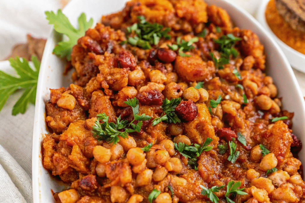 Cook onion and garlic, add tomato paste and seasonings, stir in beans, simmer until thick.