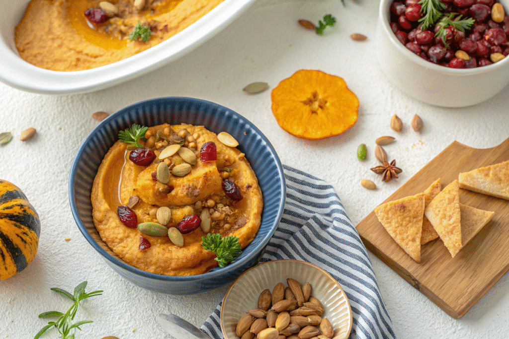 Blend chickpeas with pumpkin, tahini, syrup, and spices until creamy. Serve with crackers or fruit.