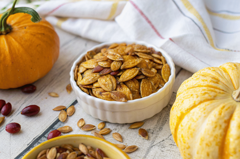 Toss seeds in oil and seasoning, air fry until crisp, shake halfway through.
