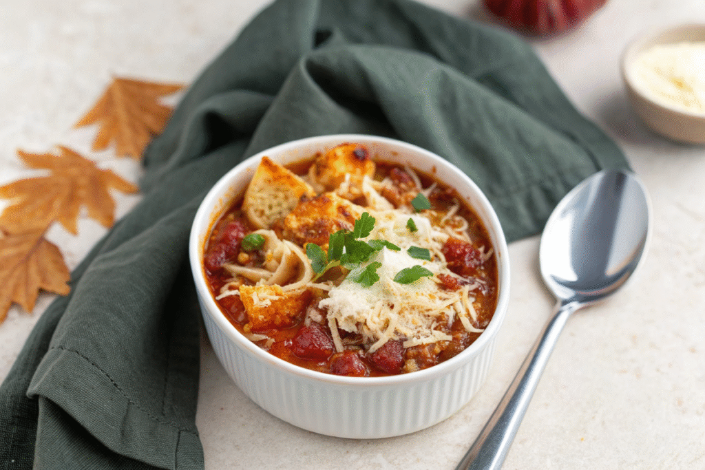 Cook meat with onion and garlic, add tomatoes and broth, simmer with noodles until tender. Top with ricotta and mozzarella before serving.