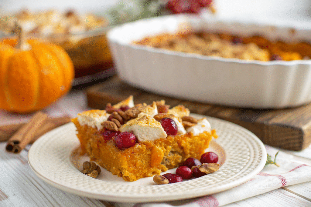 Mix sweet potato base with eggs and milk, spread in dish, top with pecan-sugar mixture, bake until bubbly.
