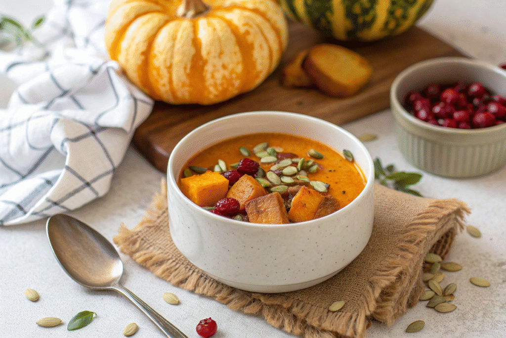 Sauté onion and garlic, add pumpkin and broth, simmer, blend smooth, stir in cream and spices.